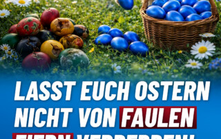 Auch wenn steigende Spritpreise, geplante Steuererhöhungen und das weitere politische Versagen der Altparteien den Puls hochtreiben, sollte man sich die Feiertage nicht verderben lassen. Schon gar nicht von „faulen Eiern“, egal ob schwarz, rot, grün oder gelb. Legt die Politik für einen Moment beiseite und genießt die Ostertage im Kreise eurer Liebsten.